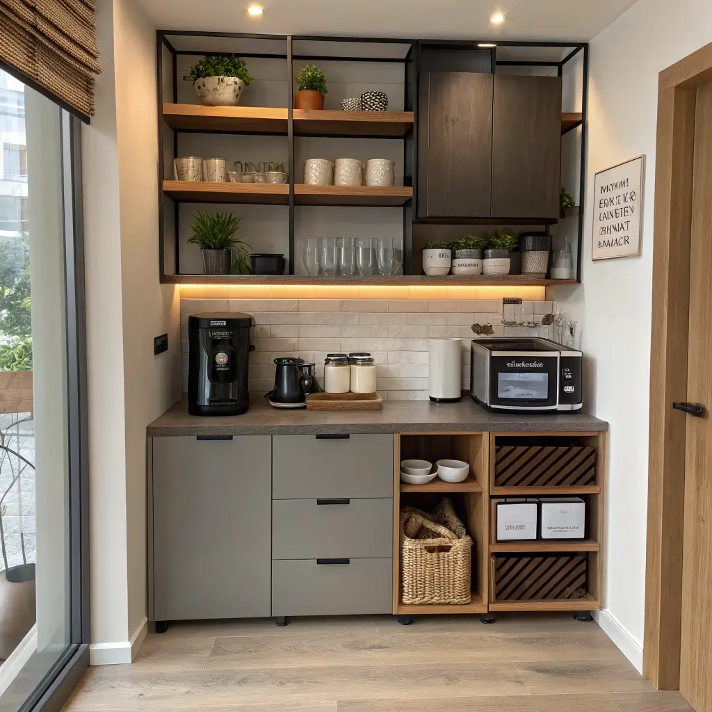 The beauty lies in the simplicity. No need for excessive decoration – the materials themselves provide all the visual interest you need. Maybe add a single piece of minimalist art or a small plant, but honestly? The coffee station stands strong on its own.