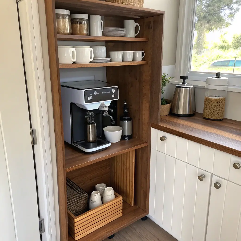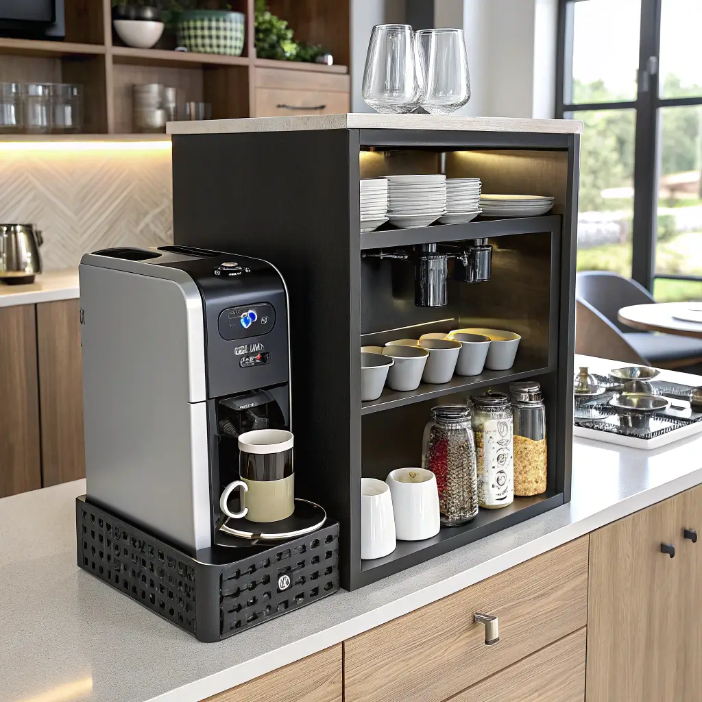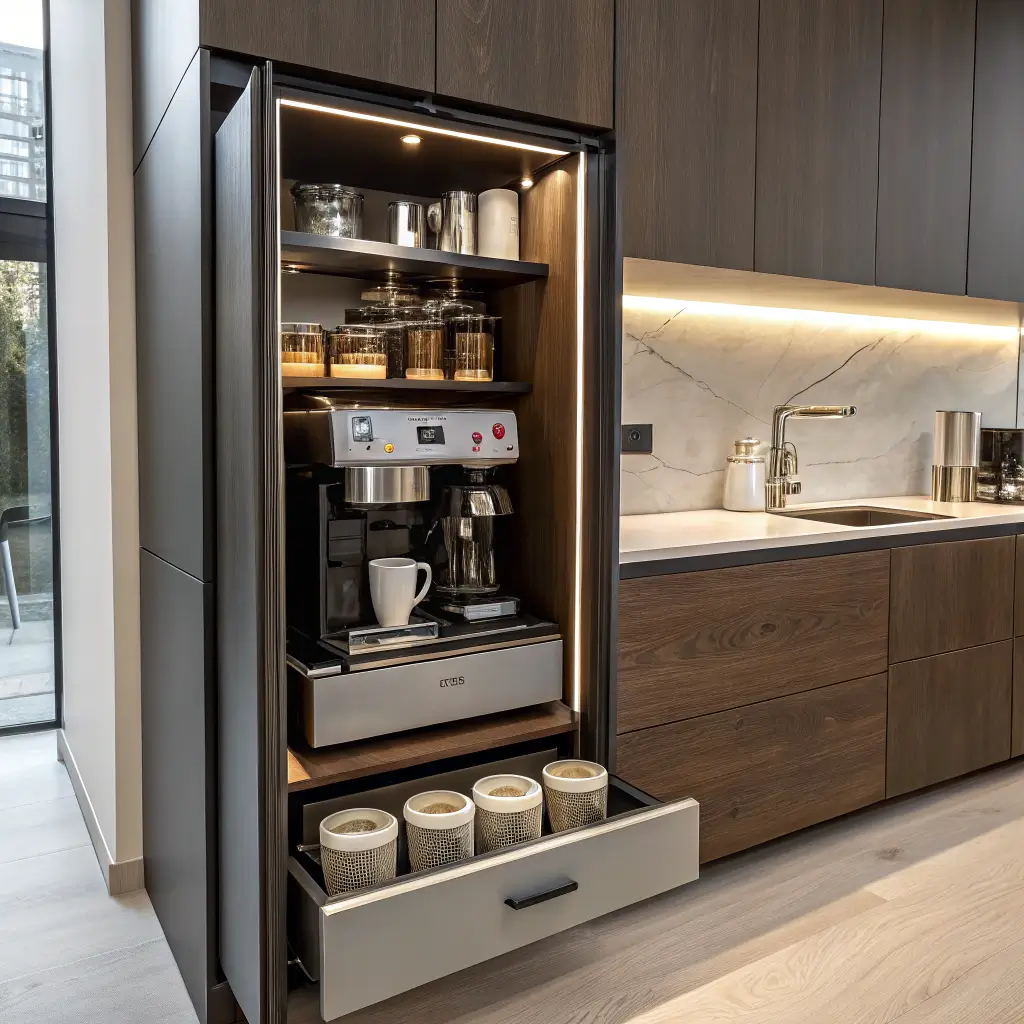 Stealth coffee stations save space and maintain clean kitchen lines. My pull-out station hides behind a regular cabinet door, revealing everything needed for coffee making when extended. Guests always gasp when I demonstrate it—super satisfying.