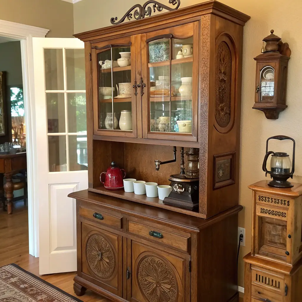 Vintage hutches offer incredible storage depth—we’re talking multiple shelves, drawers, and sometimes even secret compartments (found $20 in mine!). The glass-front upper cabinets showcase your mug collection while the lower section hides the less photogenic supplies.