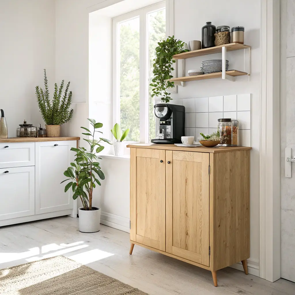 Keep decorations minimal—maybe one small plant or a simple ceramic vase. The coffee itself becomes the star, not the cabinet fighting for attention.