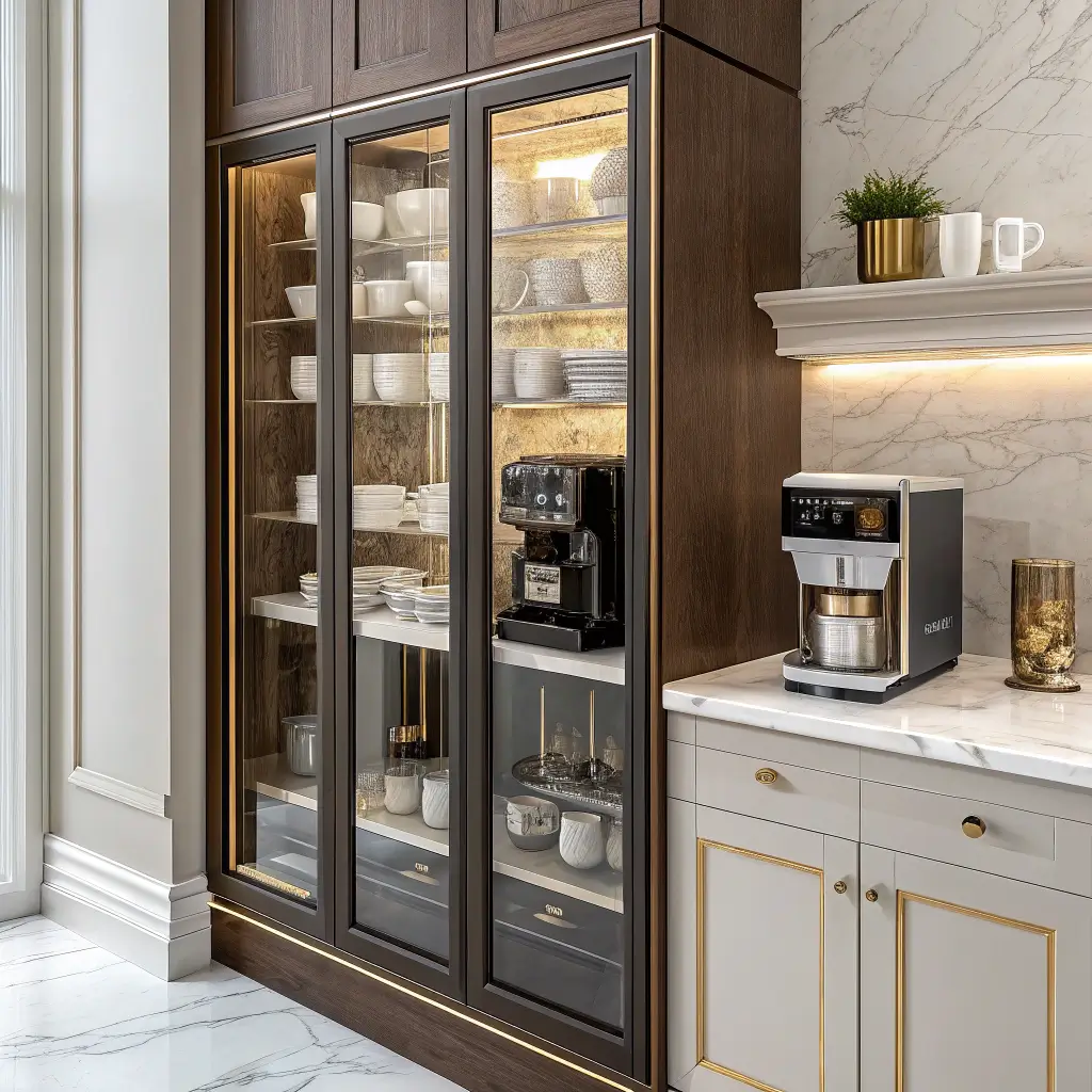 Sometimes you want to feel fancy making morning coffee. Marble-topped coffee cabinets deliver that luxury hotel vibe without leaving home. Yes, real marble costs more, but IMO, the elegance justifies the splurge.