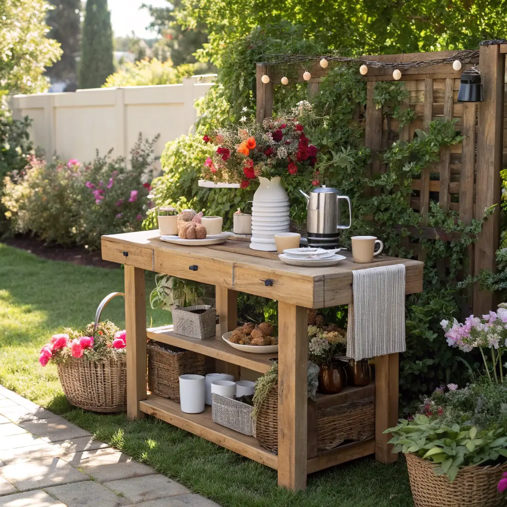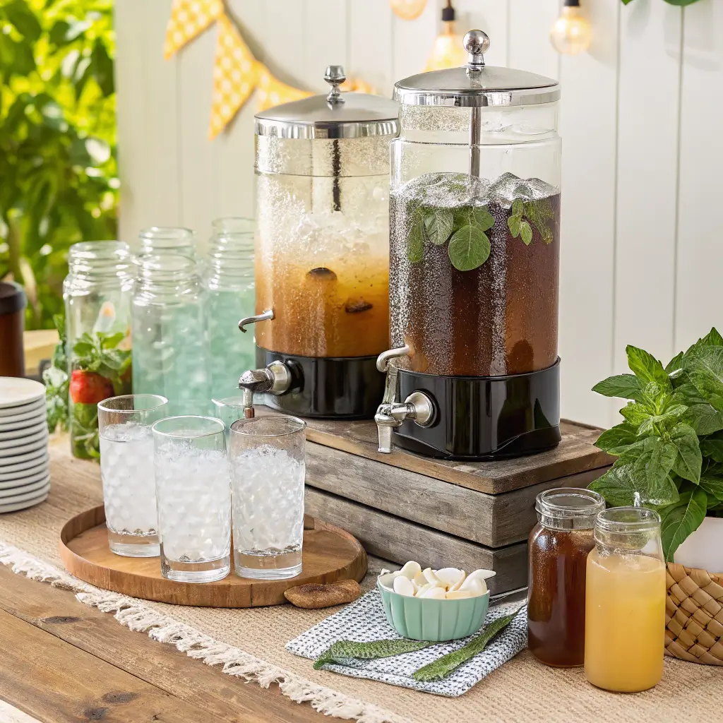 Position your station in the shade if possible. Nobody wants to stand in direct sun while waiting for coffee. Use natural decorations like potted herbs (bonus: fresh mint for drinks!), wildflowers in mason jars, and wooden serving trays.