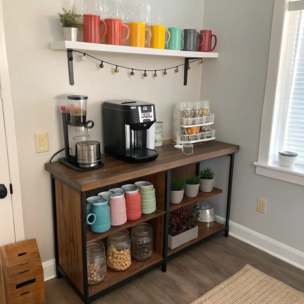 Display your coffee in glass jars with handwritten labels—instant farmhouse feels. Use mismatched vintage mugs if you have them; thrift stores are goldmines for these. String some Edison bulbs overhead if you really want to set the mood.