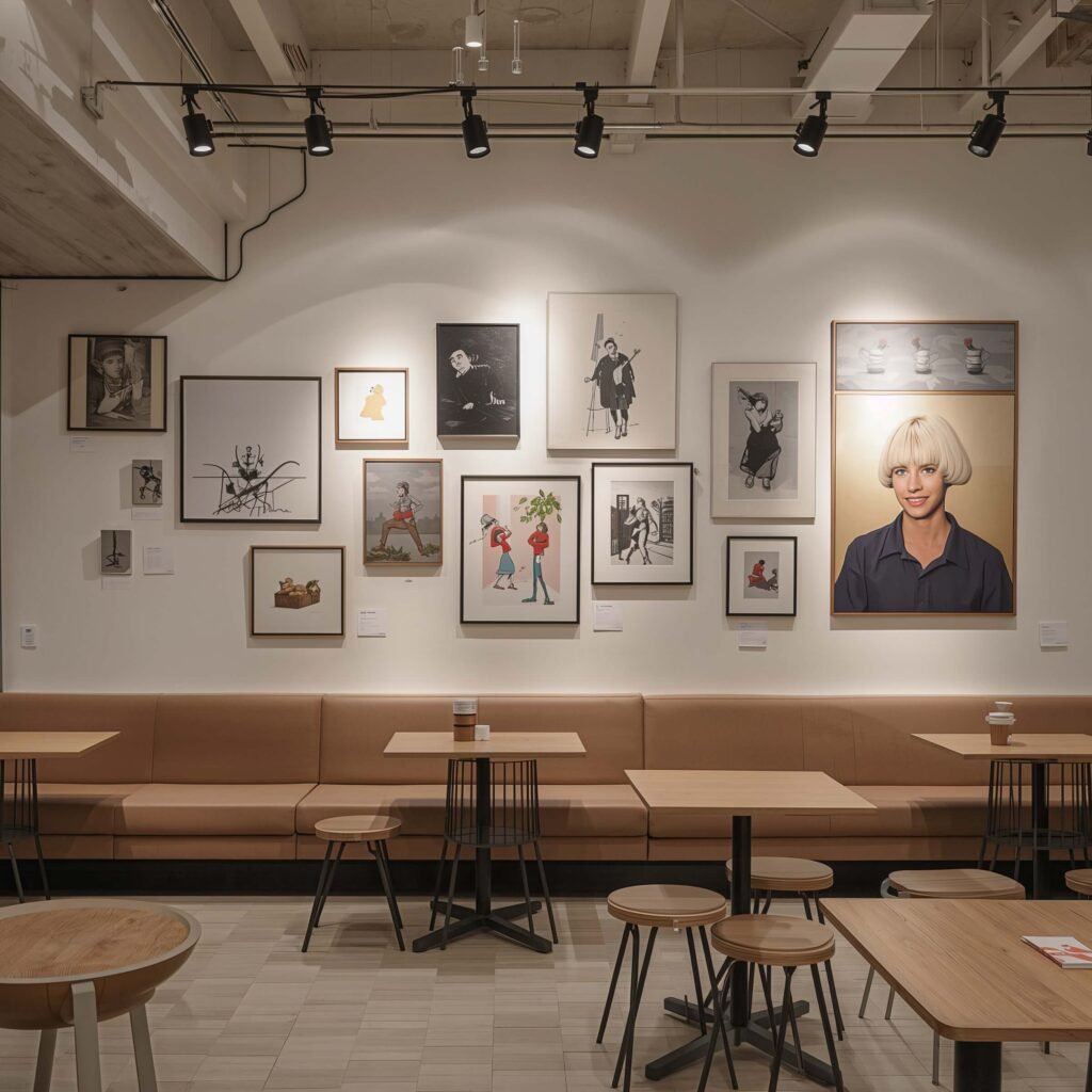 The biggest challenge? Balancing the gallery and coffee shop functions. You can’t have paintings hanging so low that someone’s backpack destroys them, but they also need to be at eye level. My advice: designate specific gallery zones that are visible but protected from the main traffic flow.