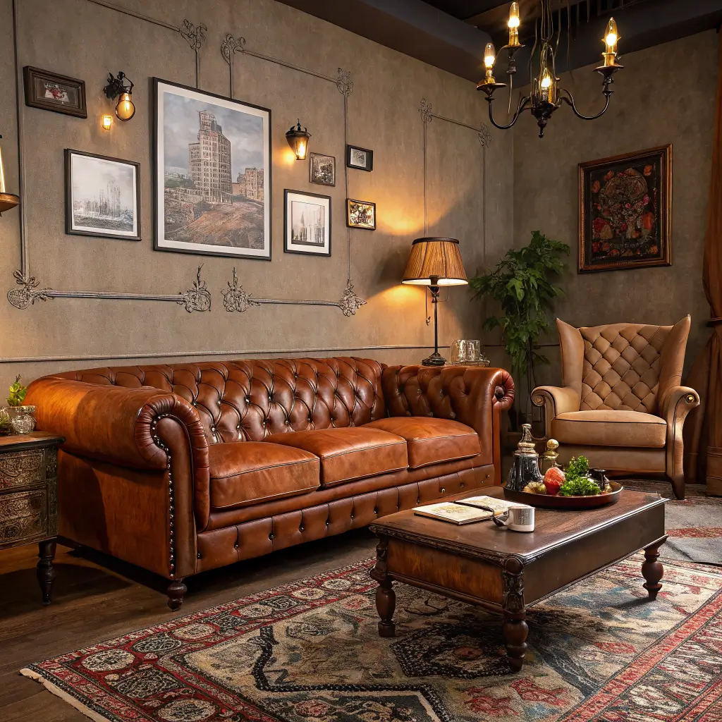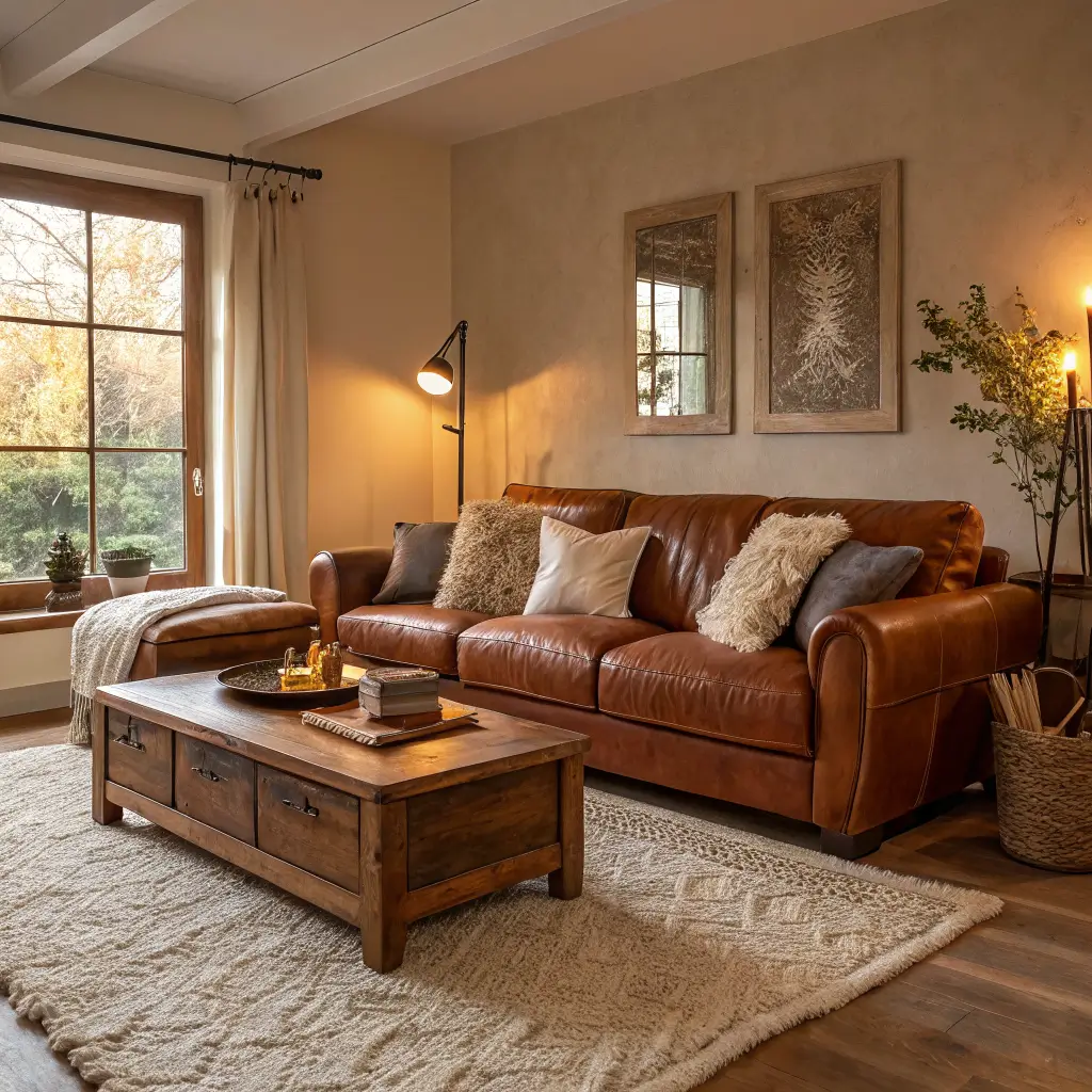 Start with reclaimed wood furniture. An old barn door converted to a coffee table? Perfect. Exposed wooden beams? Even better. The natural patina of aged wood complements the rich tones of cognac leather beautifully.
