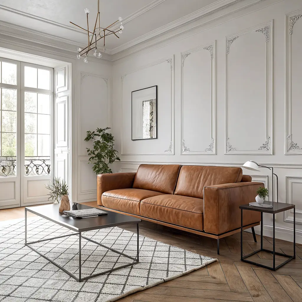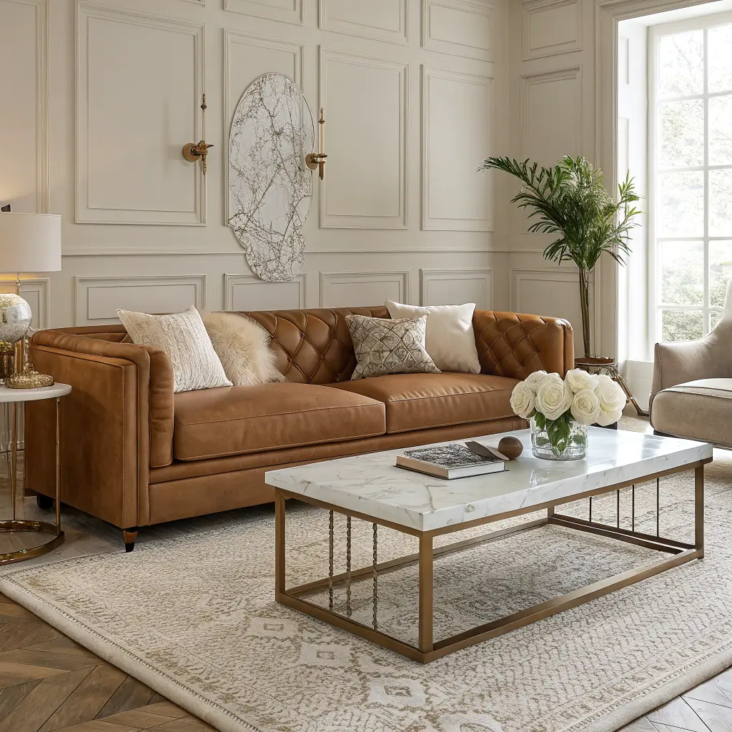 Metallic accents in gold or brass elevate the warm tones of cognac leather. A mirrored coffee table or gilded picture frames add that touch of glamour without going full Vegas casino.