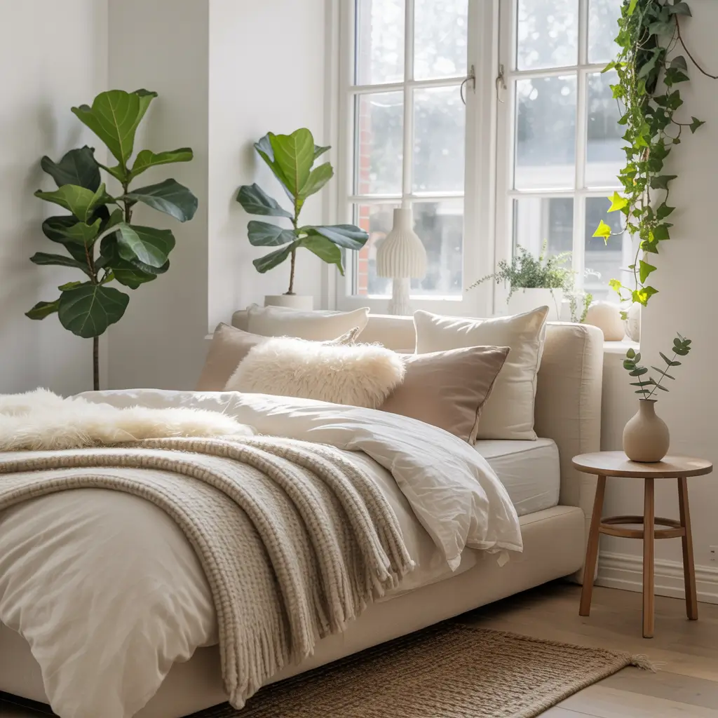 Start with a light wood bed frame and add white or light gray bedding. Bring in natural textures through wool throws, sheepskin rugs, and linen curtains. The goal? Creating warmth without clutter.