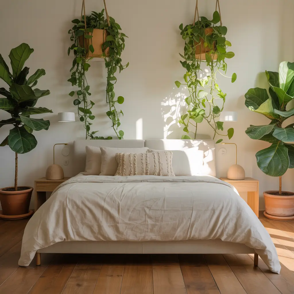 Keep it to 2-3 larger plants rather than cluttering surfaces with tiny pots. Choose planters that match your color scheme – matte black, white ceramic, or natural terracotta work with everything. And FYI, plants like snake plants and peace lilies actually improve air quality while you sleep.