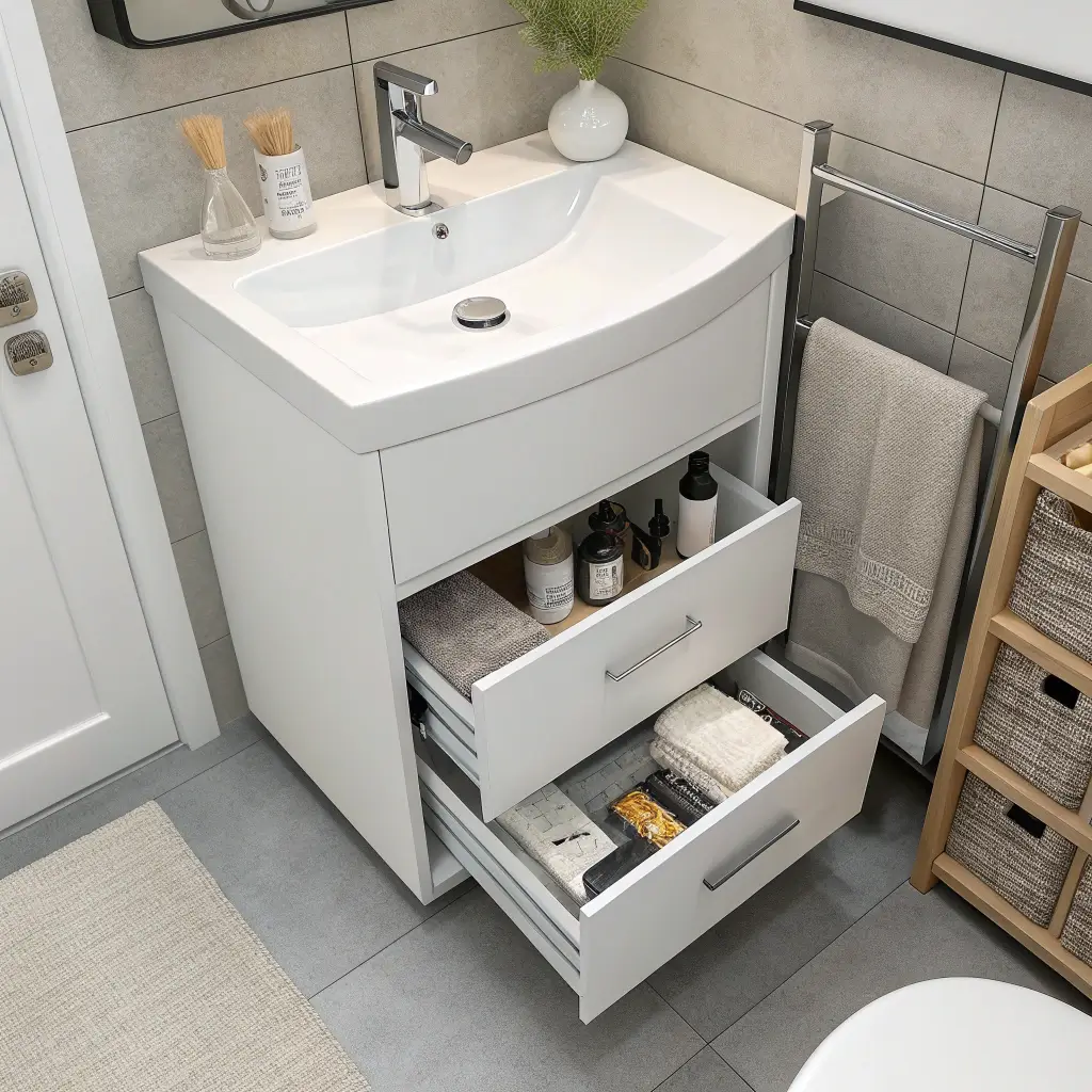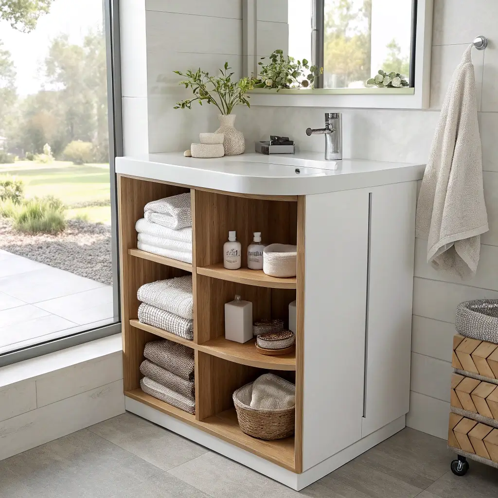 The magic of minimalist design lies in its simplicity. You get clean lines, neutral colors, and zero visual clutter. Think white or light wood finishes, simple hardware (or better yet, push-to-open mechanisms), and maybe a single drawer for essentials. The best part? Your bathroom suddenly feels twice as big because there’s nothing competing for attention.
