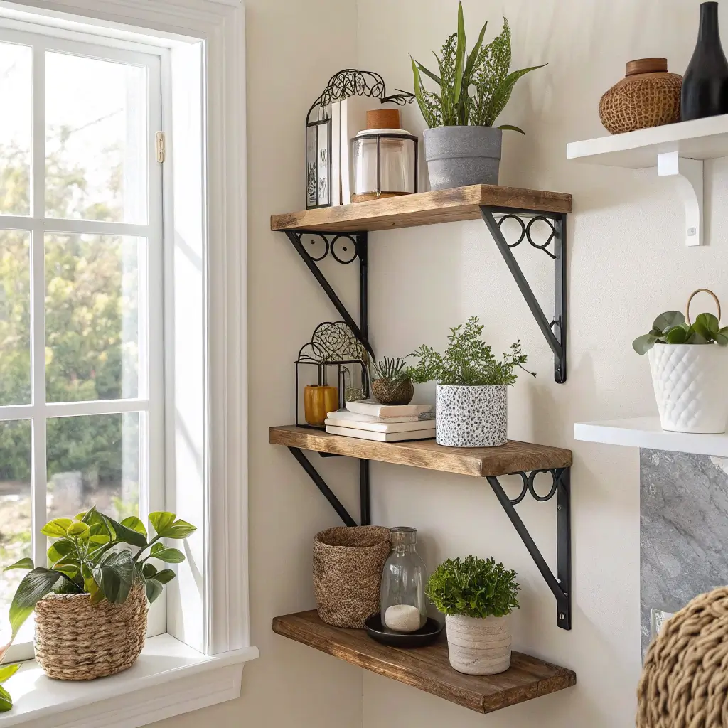 Bathroom corners are prime real estate that we often waste. Floating corner shelves in bathrooms solve storage crises while keeping things looking spa-like. I squeezed three small shelves into my powder room corner, and suddenly there’s room for actual guest towels and fancy soap.