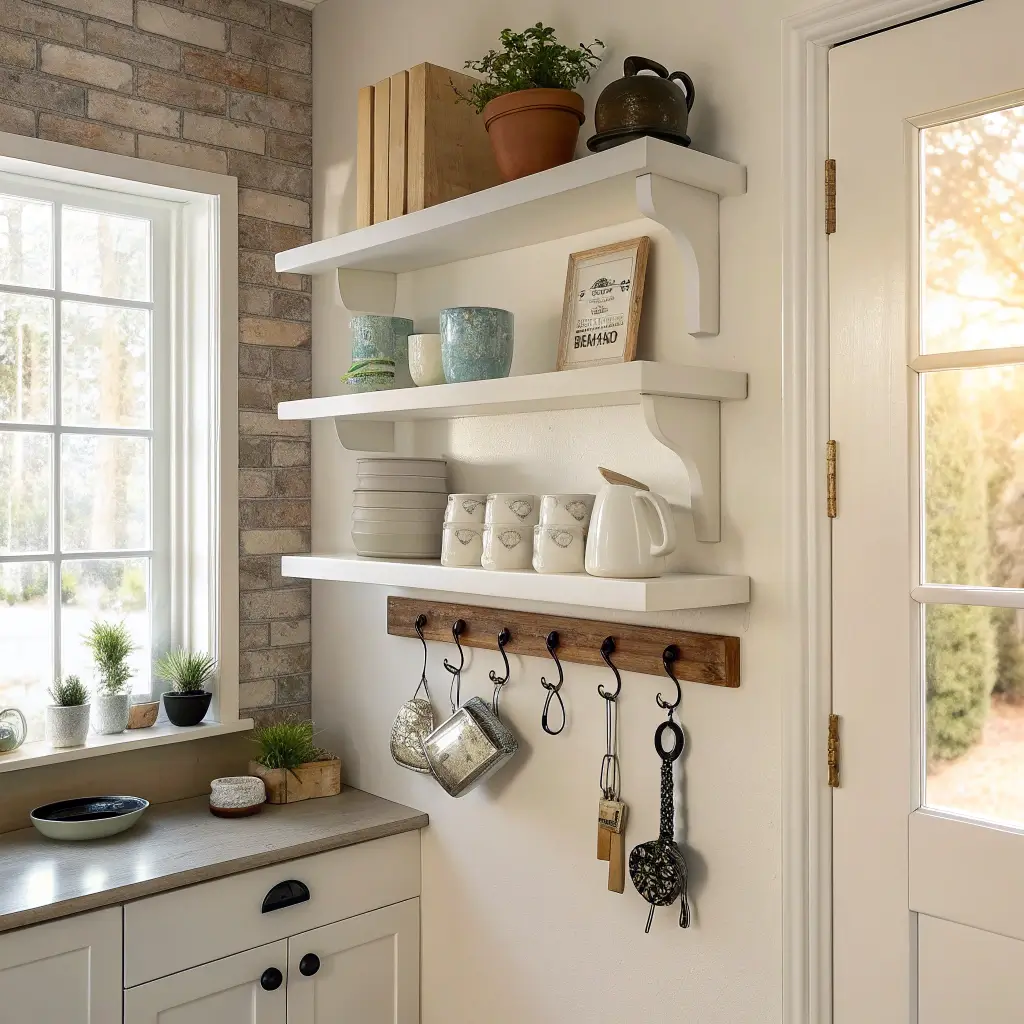 Why stop at shelving? Corner shelves with integrated hooks double your storage potential. I added these to my mudroom corner, and the combination of shelf space plus hanging storage handles everything from bags to dog leashes.