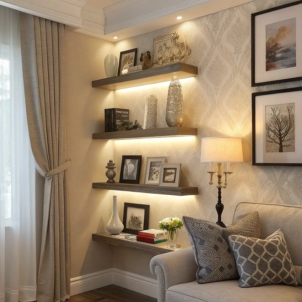 Here’s where things get fancy – floating corner shelves with integrated LED lighting. I splurged on these for my living room, and they’ve completely changed how the space feels after dark. The hidden lights create this soft underglow that’s both functional and ridiculously atmospheric.