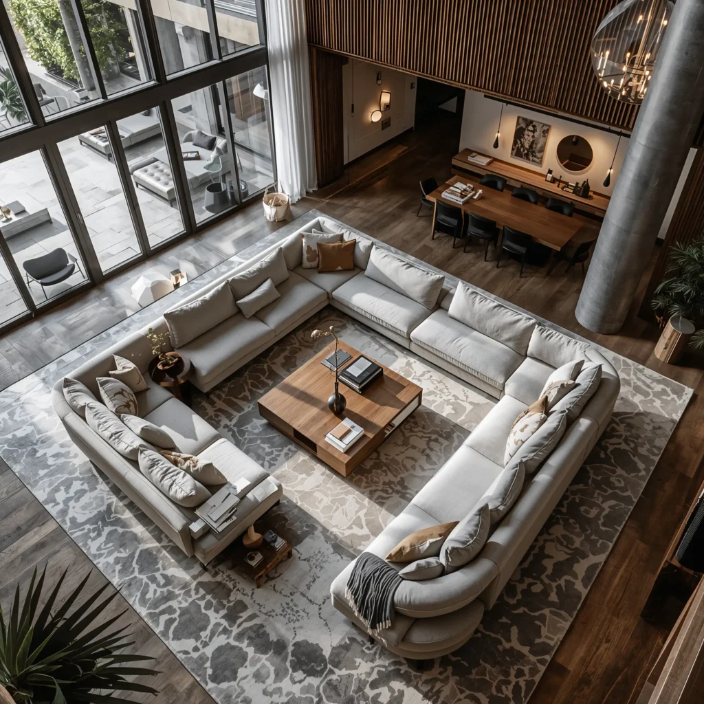 The center of a U-shaped configuration naturally becomes this amazing gathering spot. Add a large coffee table or ottoman in the middle, and you’ve created the perfect setup for board games, snacks, or just putting your feet up. It’s like having a conversation pit without the sunken floor drama.