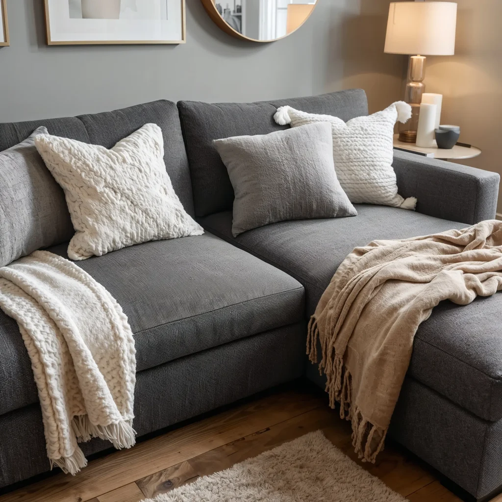 The cozy factor is real with textured cushions. There’s something about sinking into soft, plush fabric that instantly makes you feel at home. And let’s be honest – grey hides a multitude of sins when it comes to everyday wear and tear, making it perfect for families or anyone who actually uses their furniture.