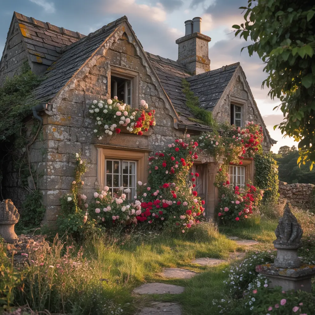 3. Rustic Stone Cottage Garden With Rose Clusters