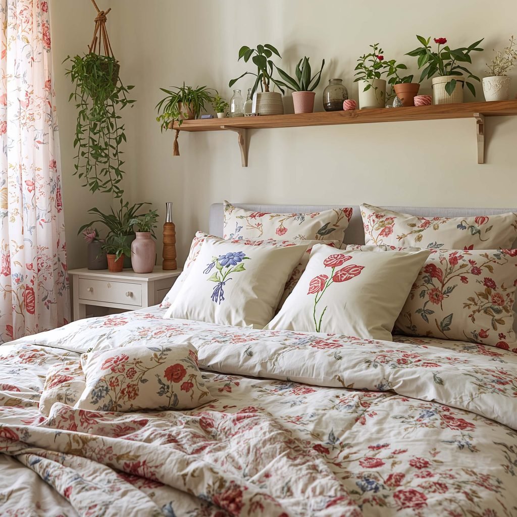 My duvet cover features tiny wildflowers on a cream background, and I’ve layered it with a vintage quilt that has embroidered daisies. The key? Mixing scales and styles of florals so it doesn’t look like you raided one fabric store.