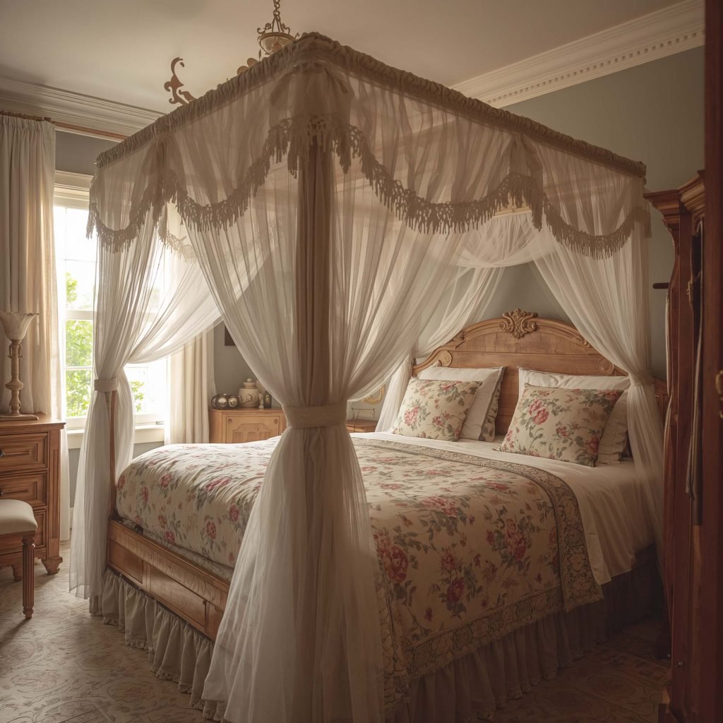 Okay, let’s talk about the ultimate cottagecore bedroom fantasy: the canopy bed. Does it make you feel like a character in a fairytale? Absolutely. Is it practical? Who cares when you’re living your best cottagecore life?