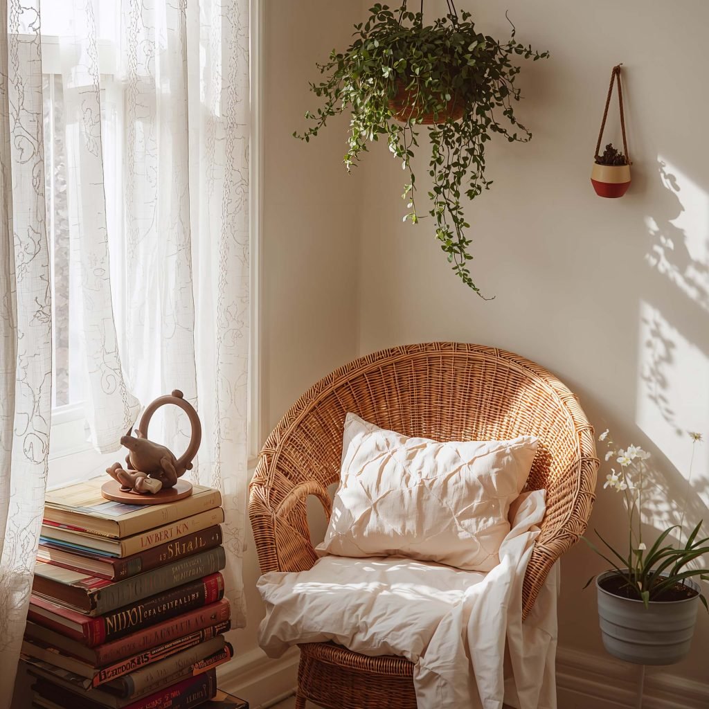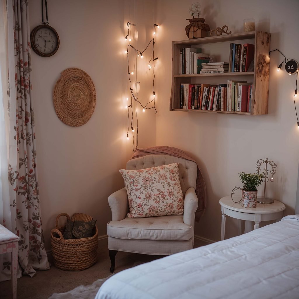 Every cottagecore bedroom needs a special corner – that one spot that makes you sigh contentedly every time you look at it. Mine? A reading corner with a vintage velvet chair, a stack of worn books, and a trailing pothos plant.