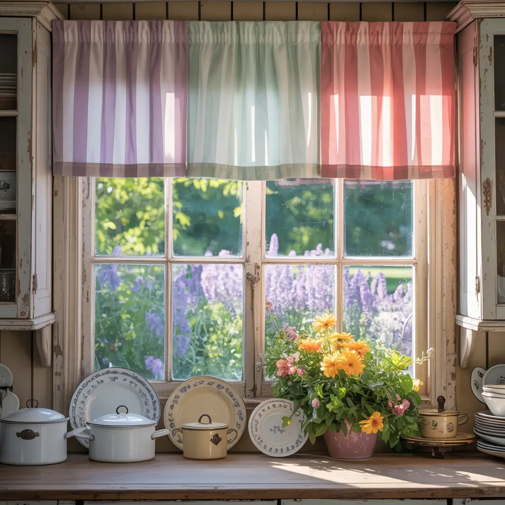 Got tiny kitchen windows that make full curtains look ridiculous? Been there! Striped valances solve this problem beautifully while adding that country touch you’re after. They frame your windows without overwhelming them.
