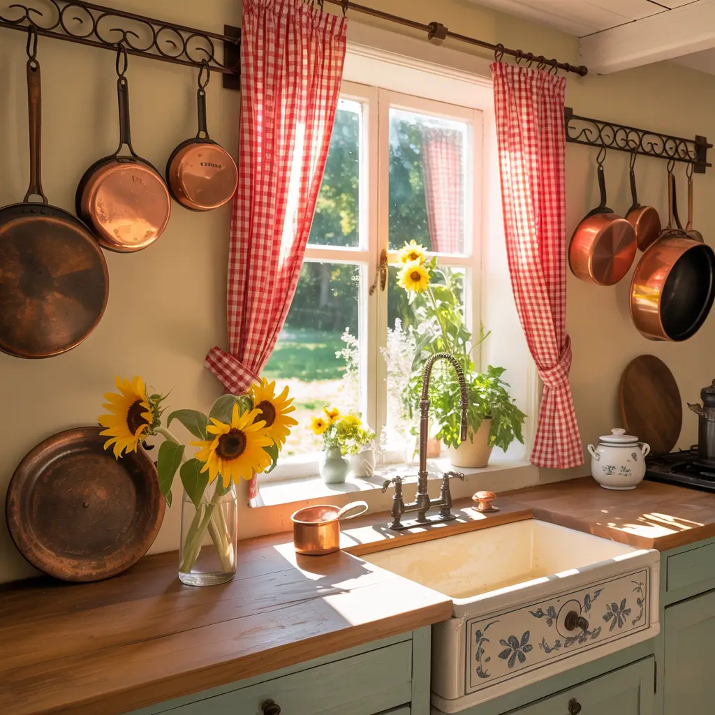 Nothing screams country kitchen quite like gingham curtains. I mean, seriously, gingham patterns have been the backbone of country decor since, well, forever. These checkered beauties bring instant warmth to any kitchen window, and they’re practically foolproof when it comes to styling.