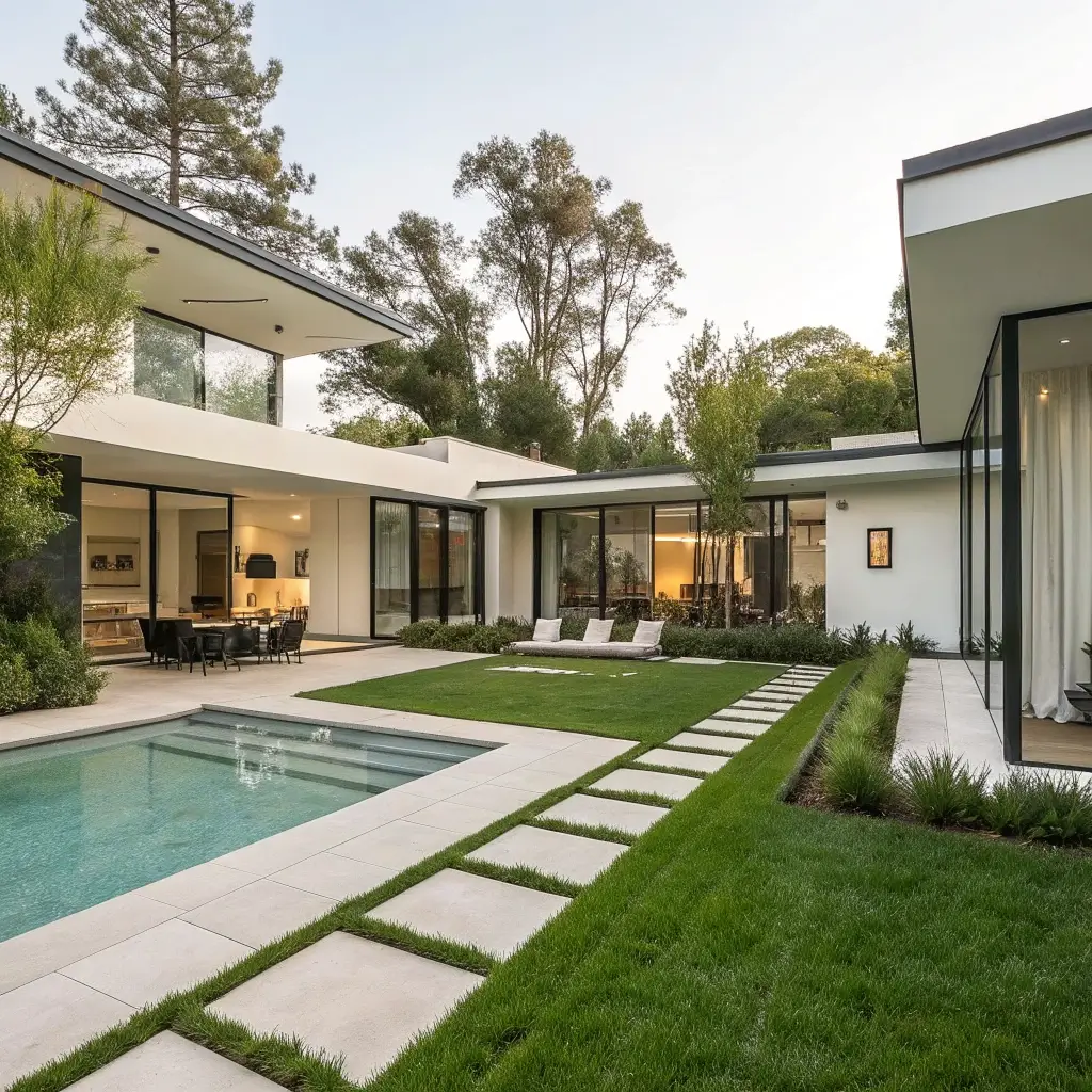 U-shaped designs are the ultimate in courtyard privacy and functionality. These layouts wrap around a central courtyard on three sides, creating an intimate outdoor room that’s completely protected from the outside world.