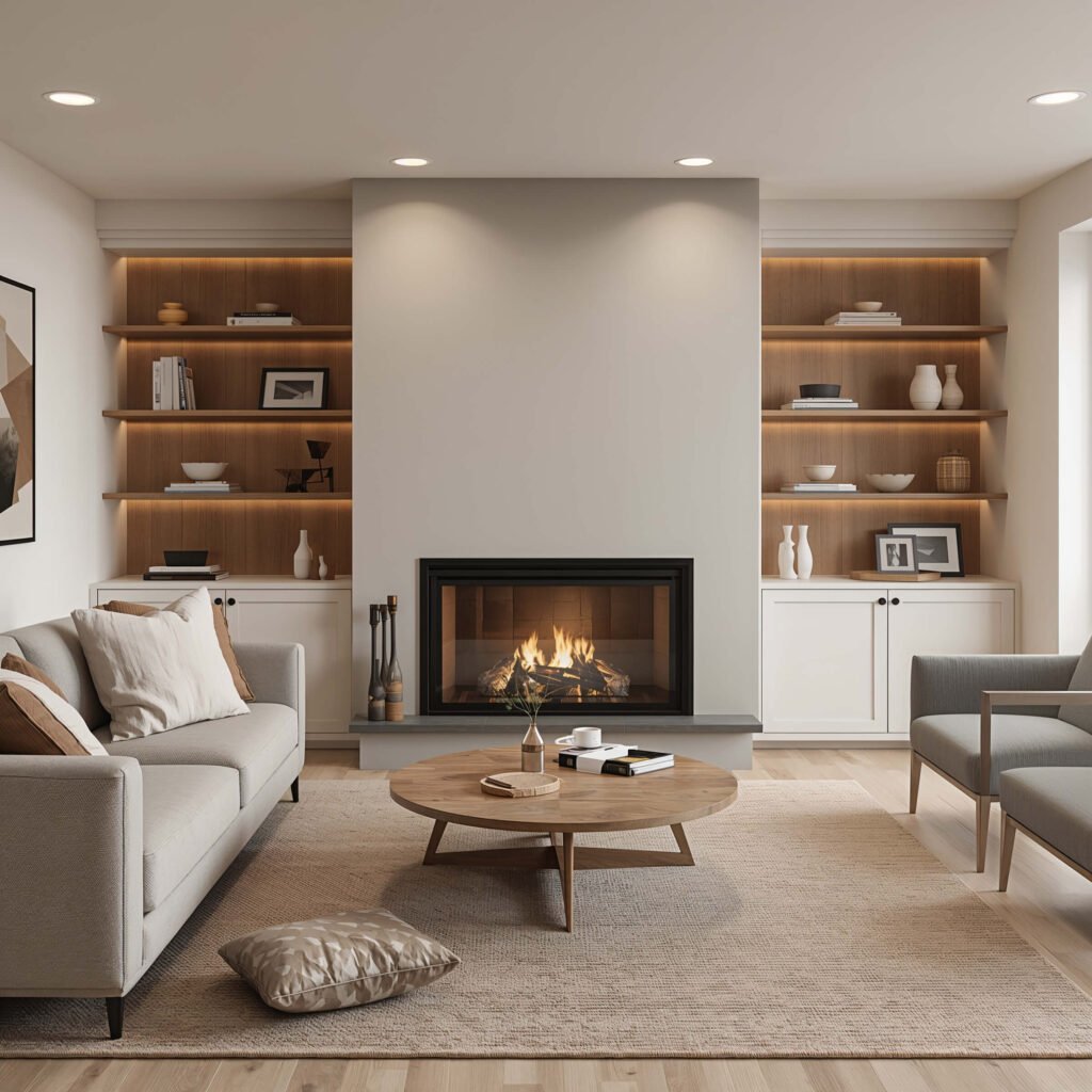 The trick is creating multiple seating areas that all benefit from the fireplace’s warmth and ambiance. I positioned two chairs at angles to the main sofa, creating a conversation pit that naturally draws people together. Add some built-in bookcases flanking the fireplace, and you’ve got yourself a basement that rivals any upstairs living room.