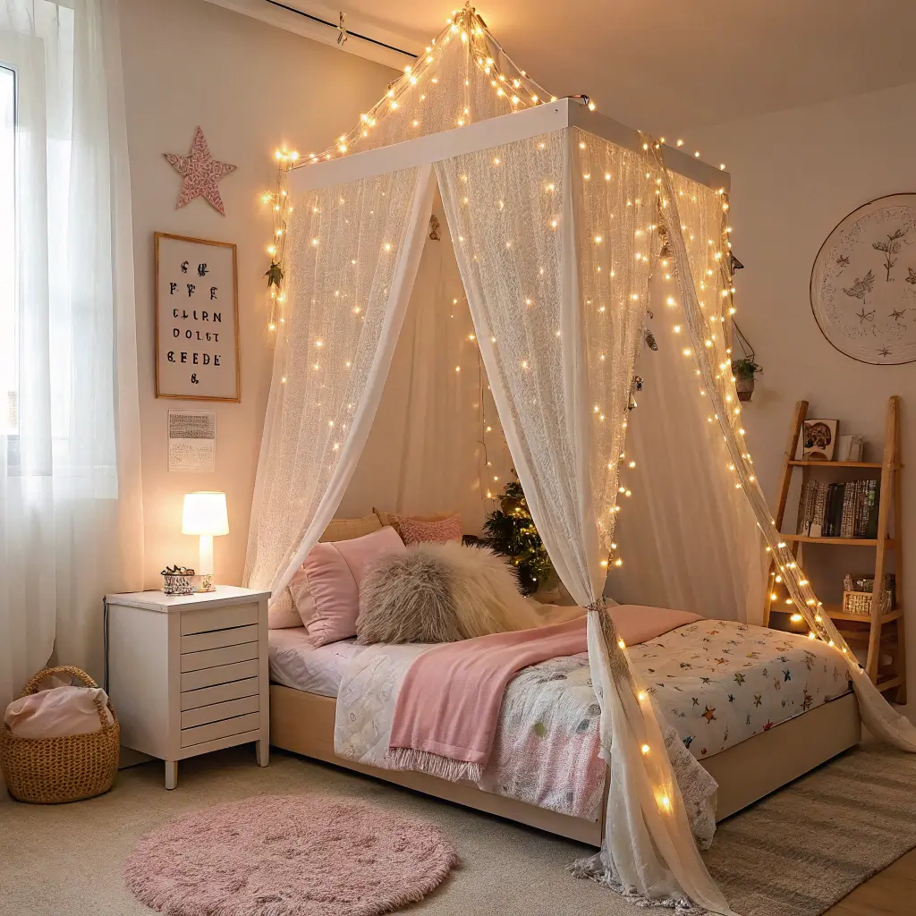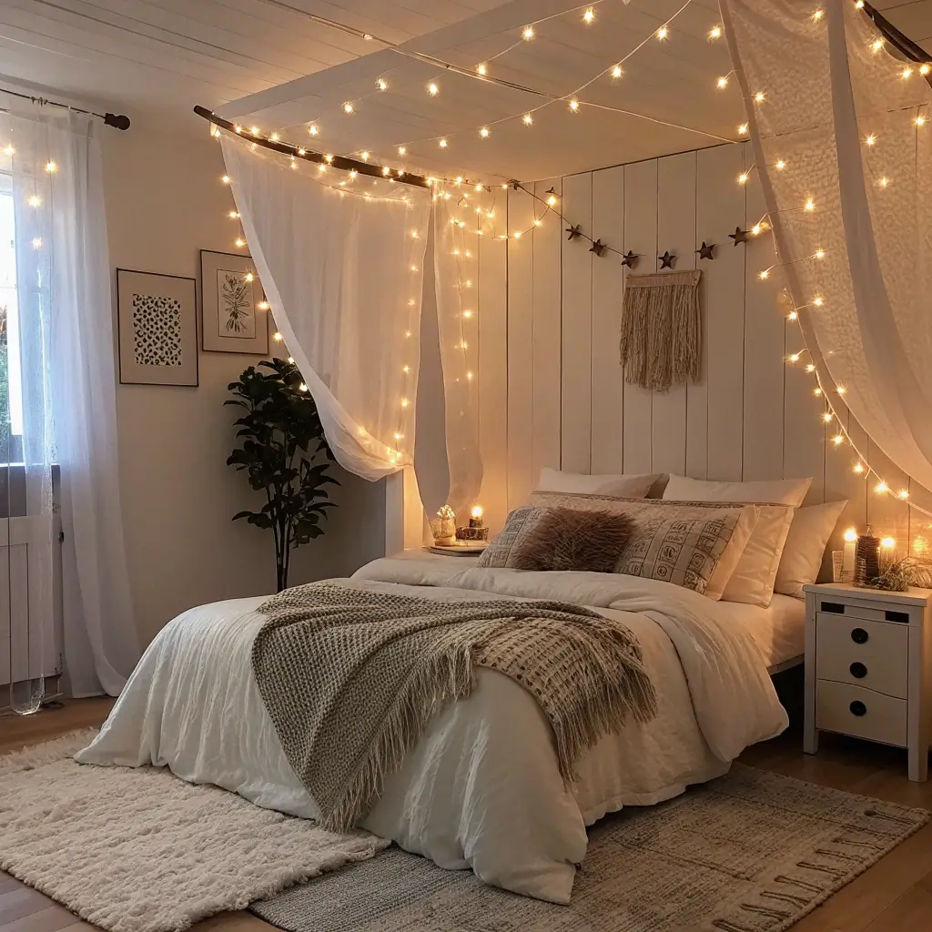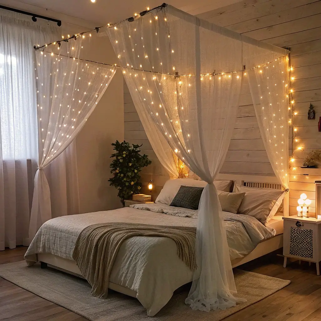 For an extra magical touch, I weave white or ivory tulle fabric between the light strands. The fabric diffuses the light beautifully and creates this soft, dreamy glow that makes you feel like you’re sleeping in a cloud. Plus, when you wake up and see those twinkling lights above you, it’s impossible to have a bad morning.