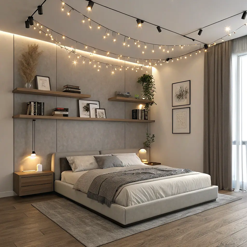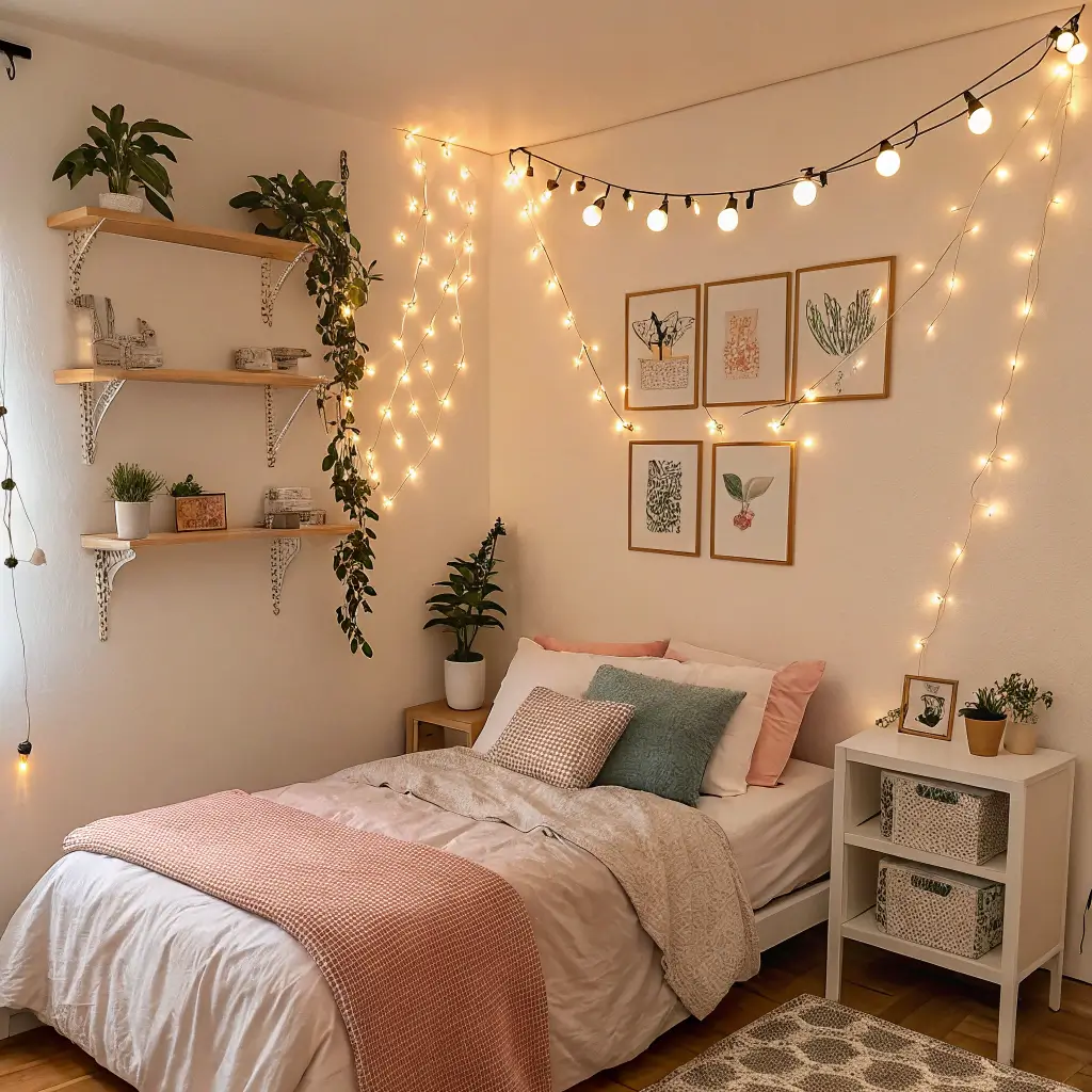 Layer your warm fairy lights at different heights throughout the room. Place some behind your headboard, others along your windowsill, and maybe a strand draped over a mirror. This creates multiple light sources that eliminate harsh shadows and make your space feel bigger and cozier simultaneously.