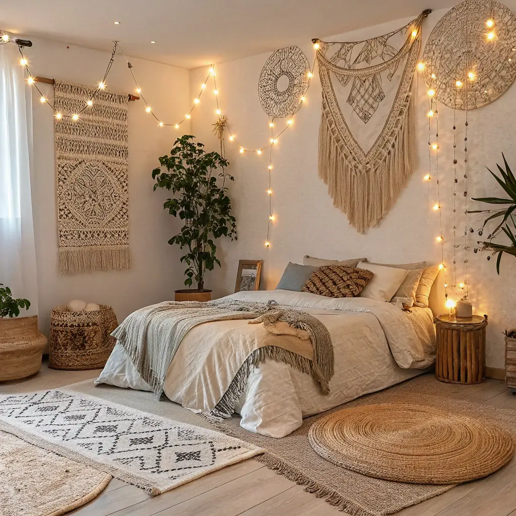 Layer different textures and heights to create that effortlessly eclectic look. String lights at varying lengths, let some droop more than others, and don’t stress about making everything perfectly even. The beauty of boho is in its casual confidence.