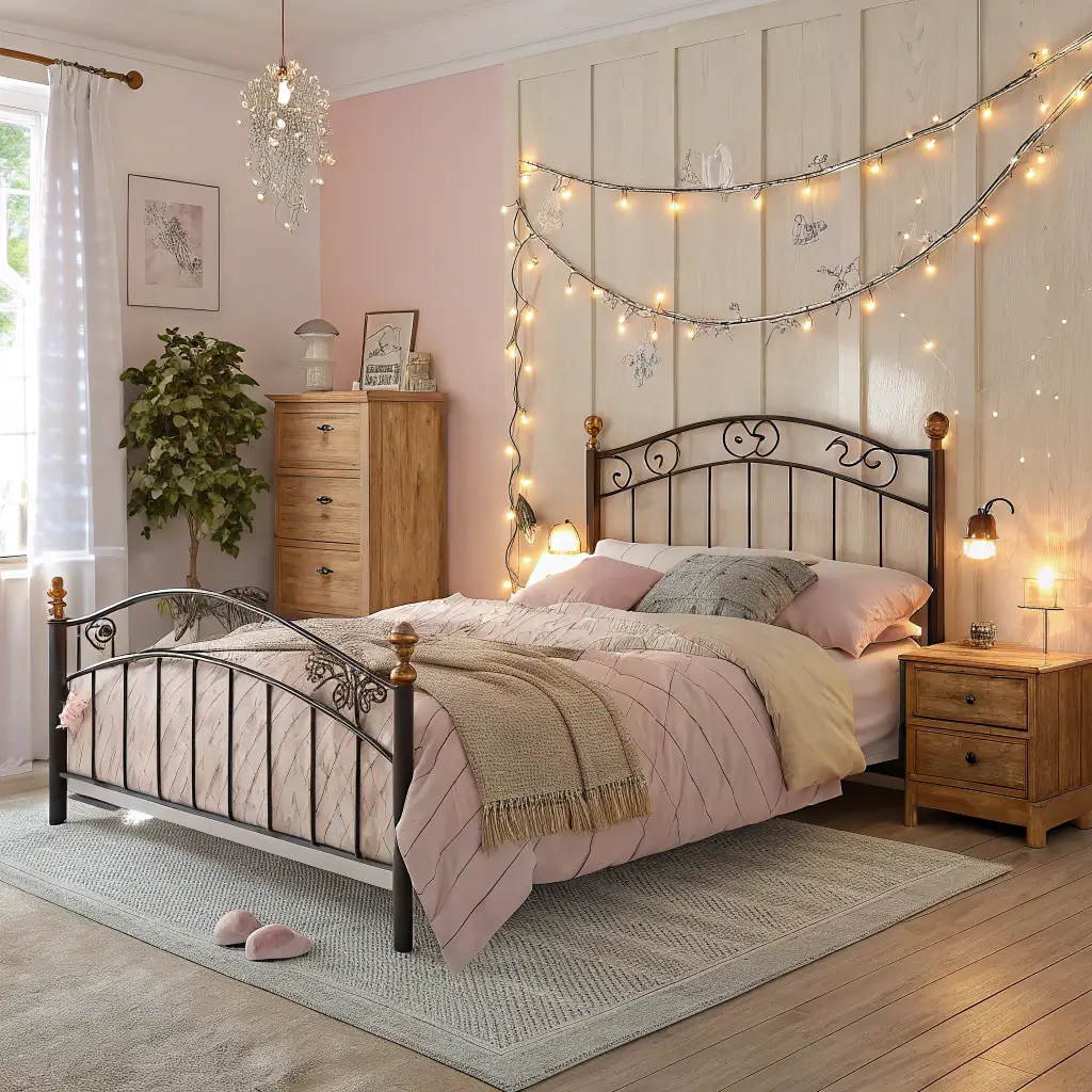 For metal frames, weave lights through the bars in a random zigzag pattern. The industrial look of metal combined with soft lighting creates this amazing contrast that feels both edgy and cozy. With wooden frames, try tucking lights behind the headboard for a subtle backlight effect.