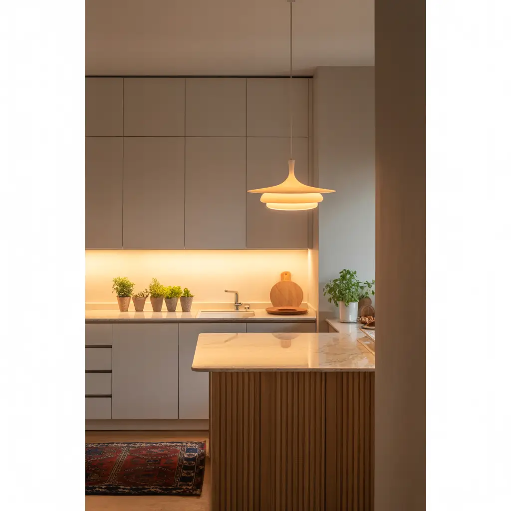 Layered lighting creates that coveted hygge atmosphere. Combine overhead fixtures with task lighting and ambient options like candles or string lights. Scandinavian kitchens often feature statement pendant lights – simple in design but impactful in presence.