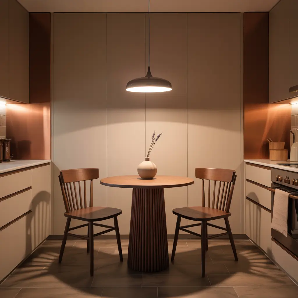 Lighting sets the mood in your nook. A pendant light centered over the table creates intimacy, while a nearby window provides natural light for morning meals. Add personal touches like a small plant, salt and pepper shakers you love, or a basket for napkins and placemats 🙂