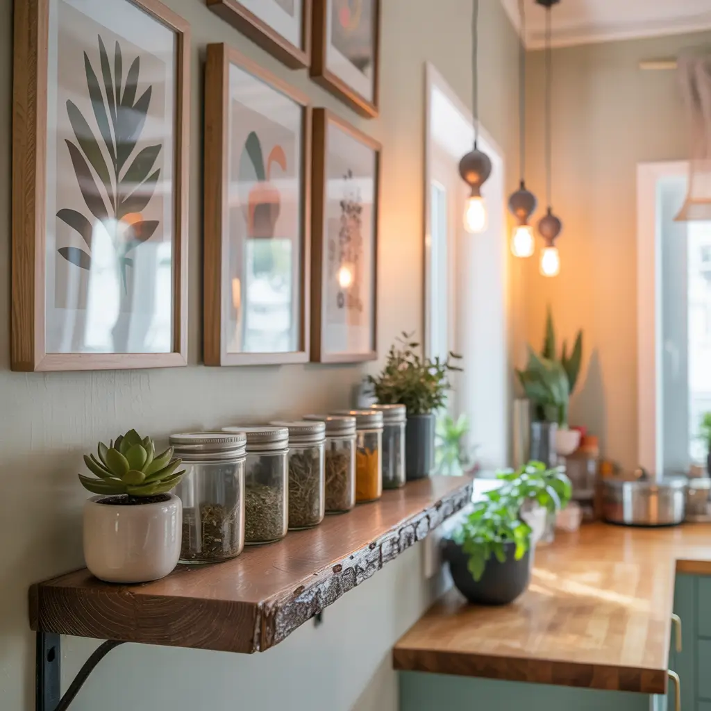 Gallery walls work beautifully in kitchens. Mix framed recipes, vintage advertisements, family photos, and even pretty cutting boards. Protect artwork with glass and choose frames that wipe clean easily.