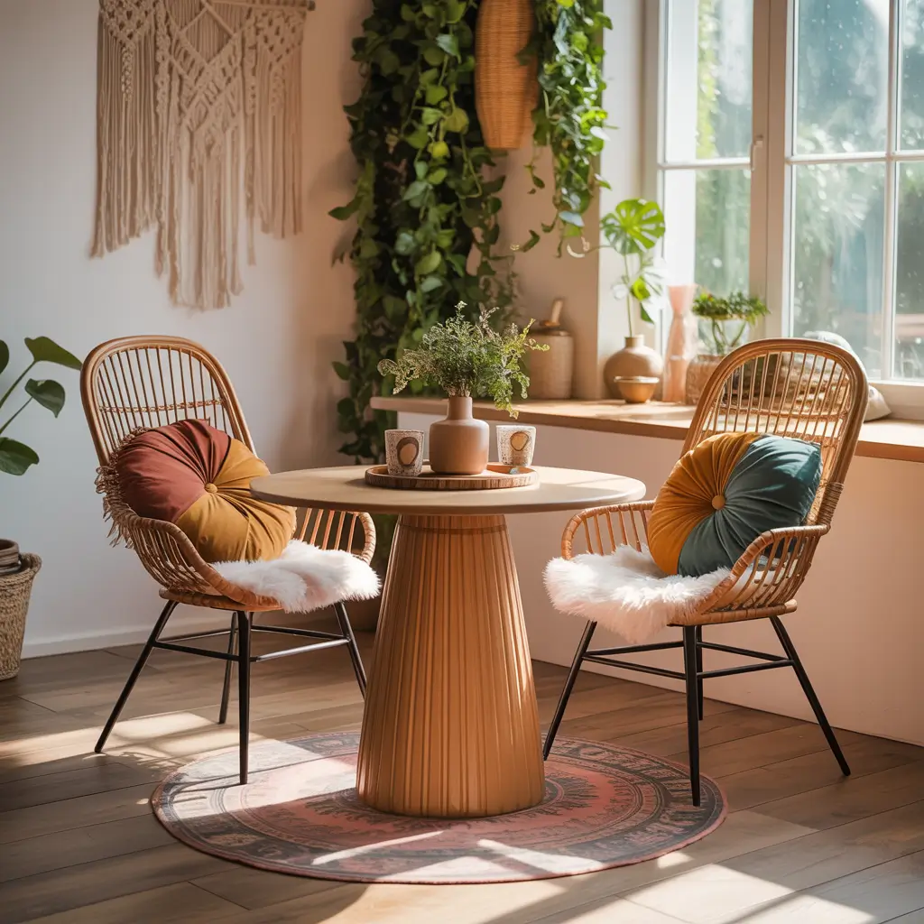 Start with a base of natural materials. Rattan chairs, a wooden table (bonus points if it’s live edge), and jute rugs set the foundation. Then layer on the boho magic with colorful throw pillows, macramé wall hangings, and vintage textiles.