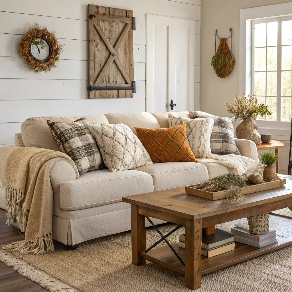 Neutral Toned Cozy Farmhouse Sofa Setup