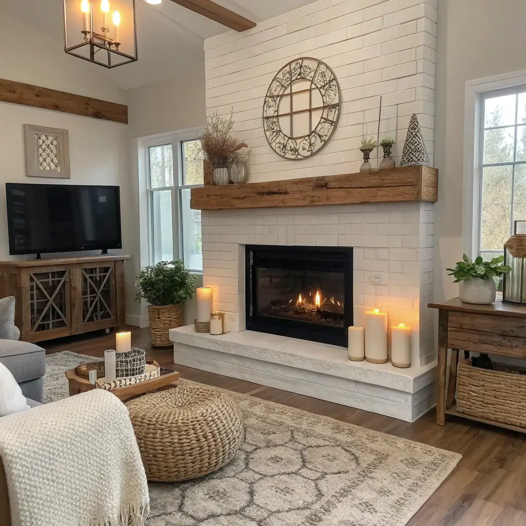 Nothing says cozy quite like a fireplace, and in farmhouse style, it becomes your room’s natural focal point. Whether you’re working with a traditional wood-burning fireplace or a modern electric insert, the mantel styling makes or breaks the look.