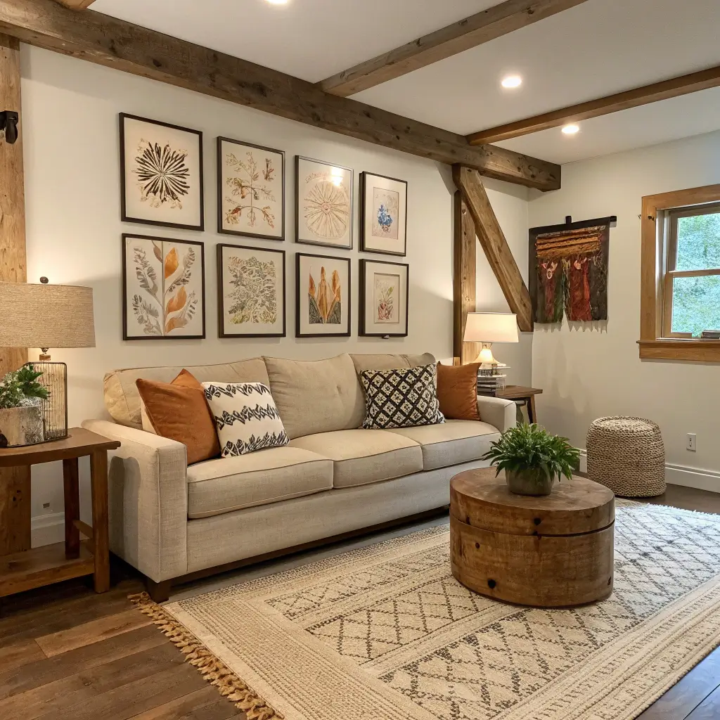 Keep artwork at eye level (center at 57-60 inches from floor). Nothing ruins a gallery wall faster than neck strain.