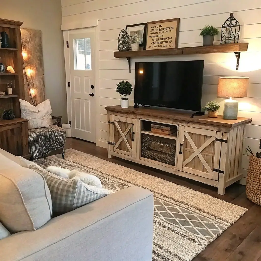 Your TV doesn’t have to be an eyesore in farmhouse design. A well-chosen media console anchors your entertainment area while providing crucial storage for all those cables and remotes nobody wants to see.