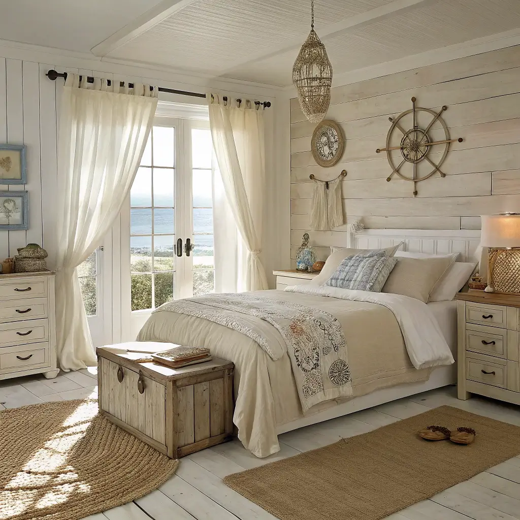 My parents’ beach house bedroom nails this aesthetic perfectly. They’ve created this serene space using weathered wood, natural textures, and subtle coastal nods. No cheesy seashell border in sight!