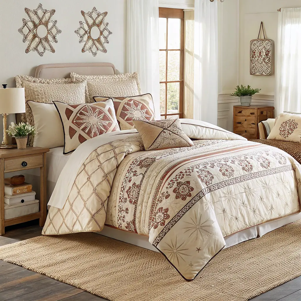 Who says neutral means no patterns? Strategic use of patterned bedding can add visual interest without overwhelming your calm color scheme. The trick is choosing patterns that play within the cream and beige family.