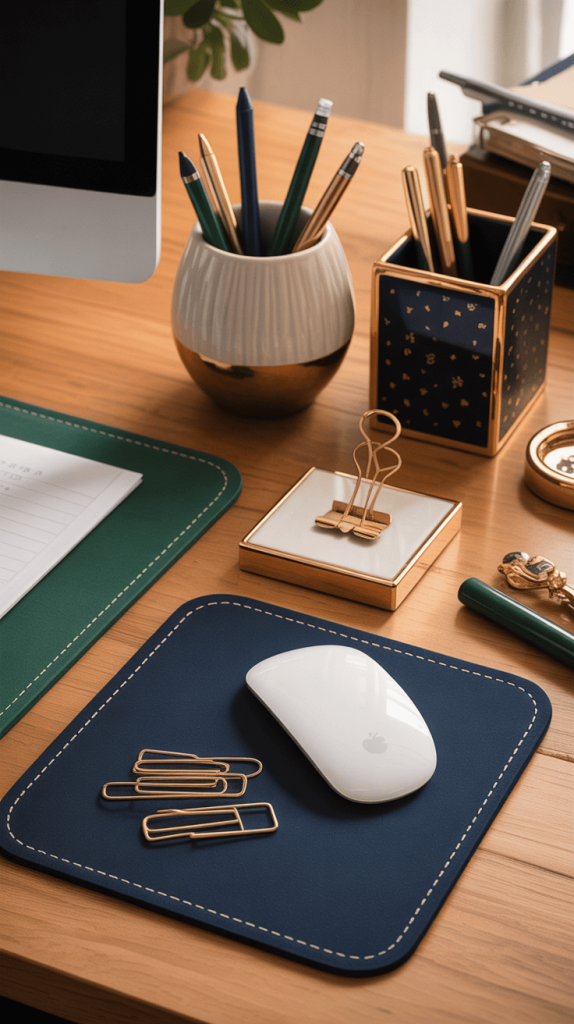 - Coordinate Your Essentials: Your mouse, keyboard, notebook, pen cup, and organizers should all fit within your chosen palette. This creates a sense of calm and order.