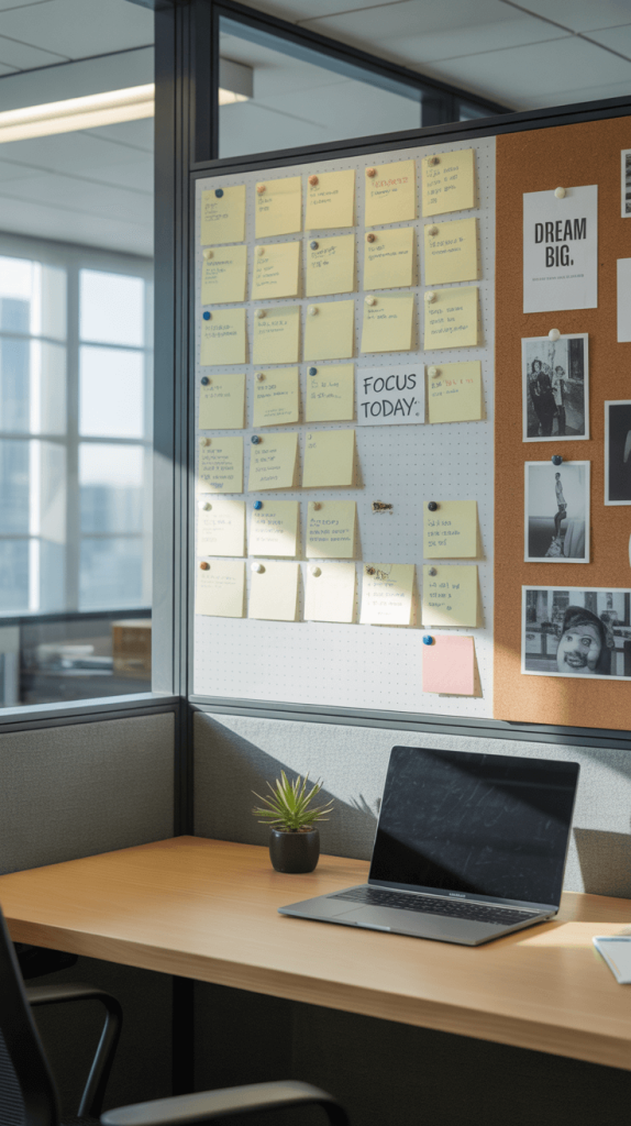 A personal board—whether it’s a whiteboard for scribbling ideas or a corkboard for pinning reminders—is one of the most practical tools you can add.