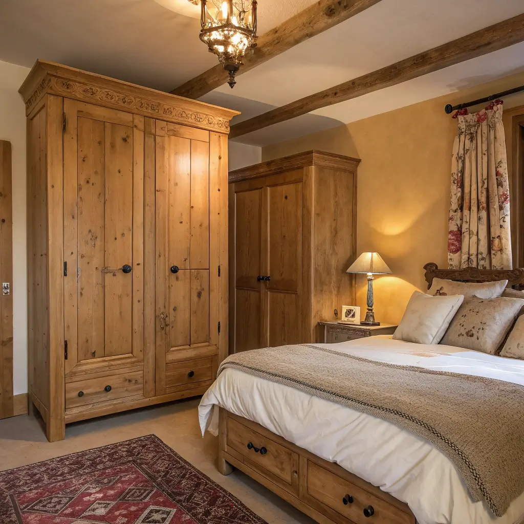You want wood that tells a story – think reclaimed barn wood, distressed oak, or weathered pine. The imperfections become features, not flaws. Every knot, grain pattern, and color variation adds to the charm. Plus, wooden wardrobes age beautifully, developing more character over time.