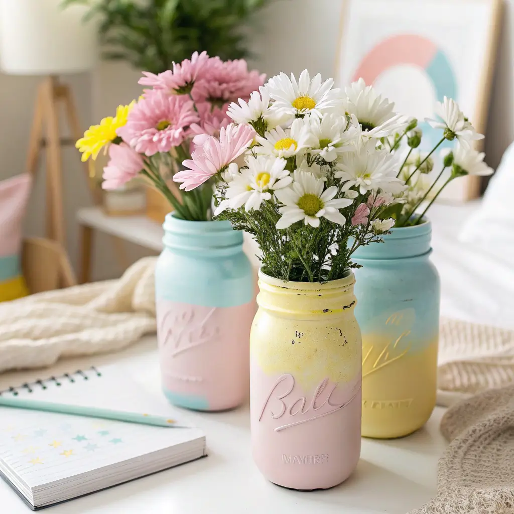 Try ombre effects by blending two colors while the paint’s still wet. Or create a mercury glass effect with metallic spray paint and vinegar (YouTube this technique – it’s wild). Group odd numbers of jars together for better visual impact, and vary the heights for a professional designer look.
