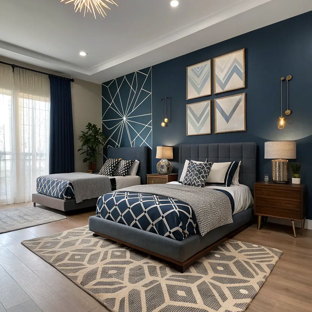 Geometry class finally pays off! Dark blue walls provide the perfect backdrop for bold geometric patterns. We’re talking angular furniture, graphic prints, and patterns that make your eyes happy.