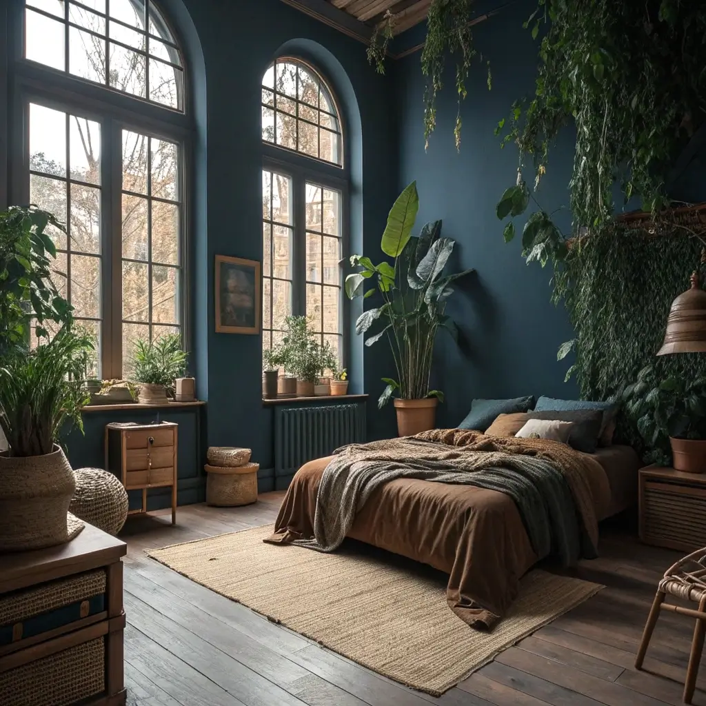 Start with your dark blue base, then layer on the textures like your life depends on it. Macramé wall hangings, woven baskets, plants trailing from every surface—the more, the merrier. This style gives you permission to break all those minimalist rules we just talked about.