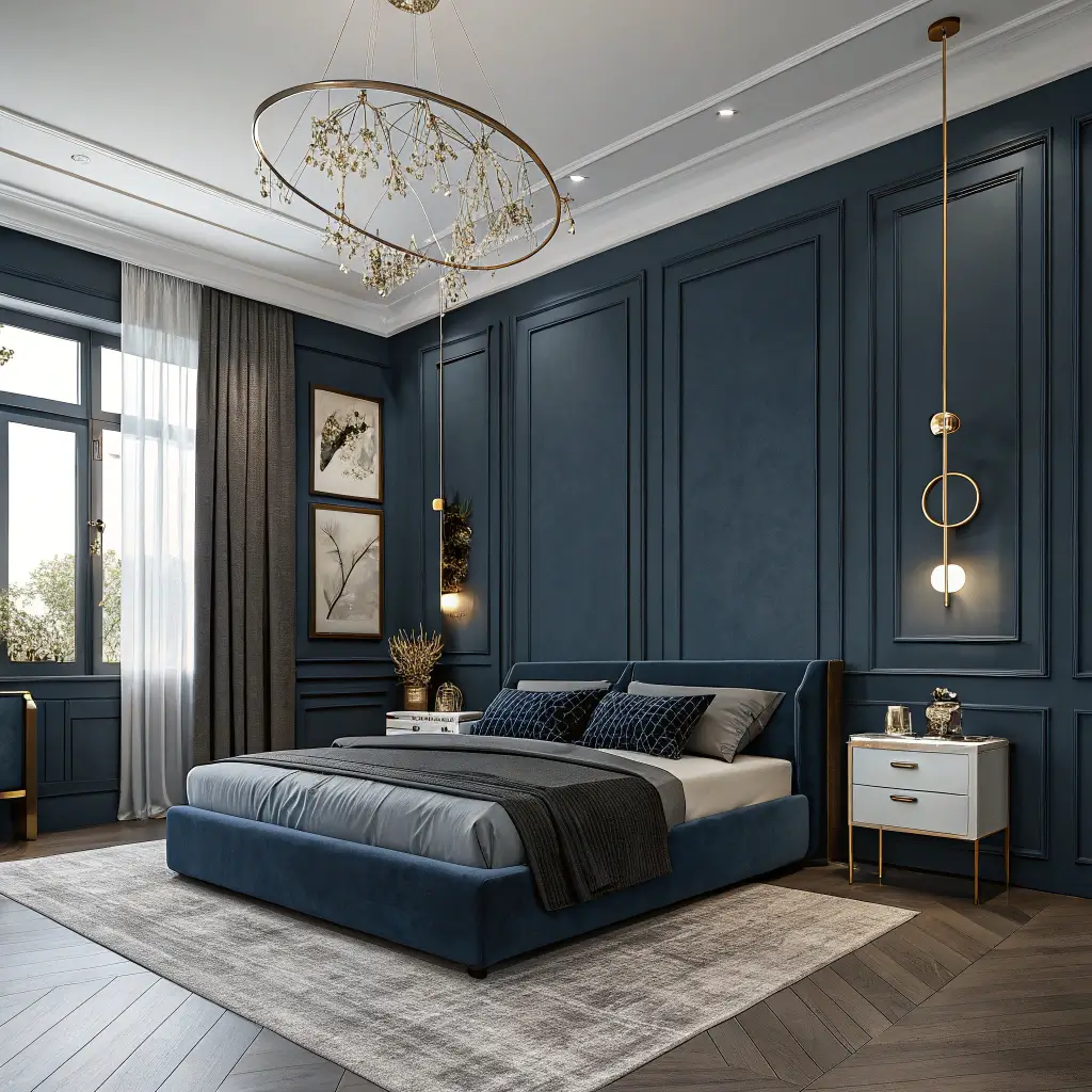 Channel your inner Gatsby with dark blue Art Deco glamour. This style screams sophistication with its geometric patterns, metallic accents, and luxurious materials. It’s like your bedroom traveled back to the 1920s and returned with impeccable taste.