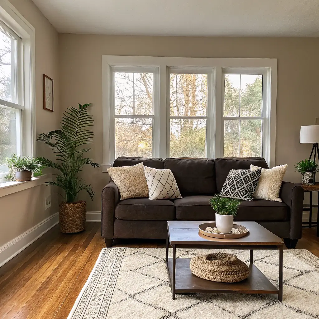 Cozy Neutral Living Room with Dark Brown Couch