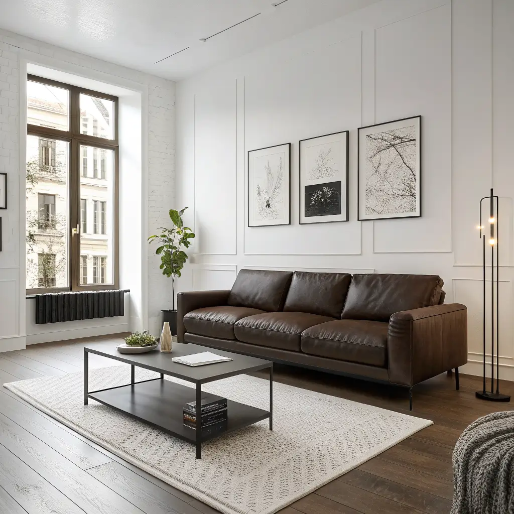 Who says minimalism has to be all white and gray? A dark brown couch works brilliantly in minimalist spaces when you keep everything else super clean and simple.