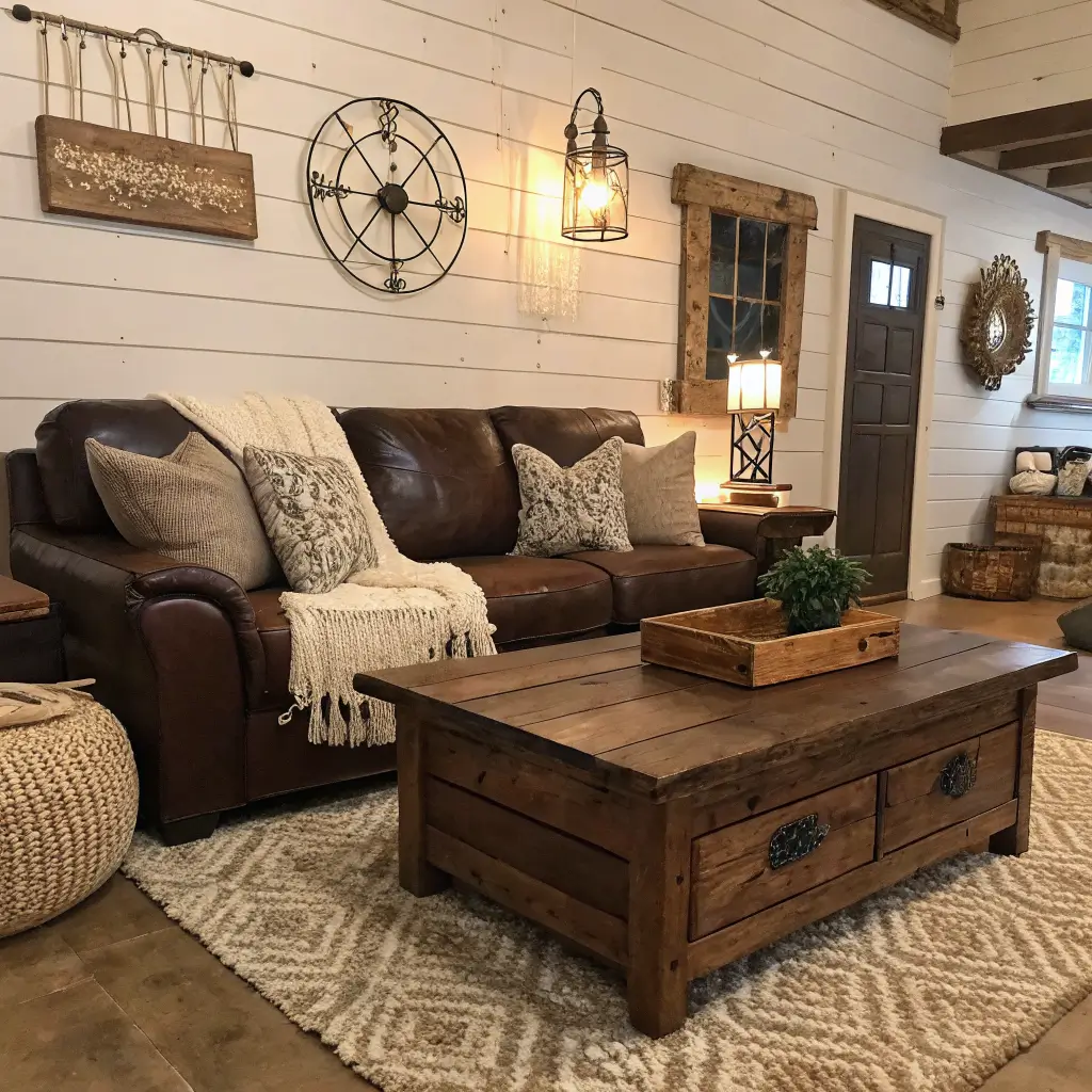 Start with shiplap or board-and-batten walls if you’re feeling ambitious. Can’t commit to that? No problem – just add some reclaimed wood shelving or a barn door. Your brown couch instantly looks like it’s been in the family for generations (in the best way possible).